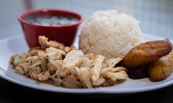 Platos are Served with White Rice, Black Beans, and Maduros.